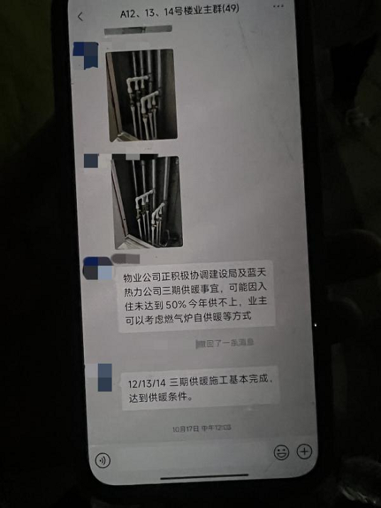 业主提供的2025年10月17日群聊记录显示:“12/13/14号楼三期供暖施工基本完成,达到供暖条件。”