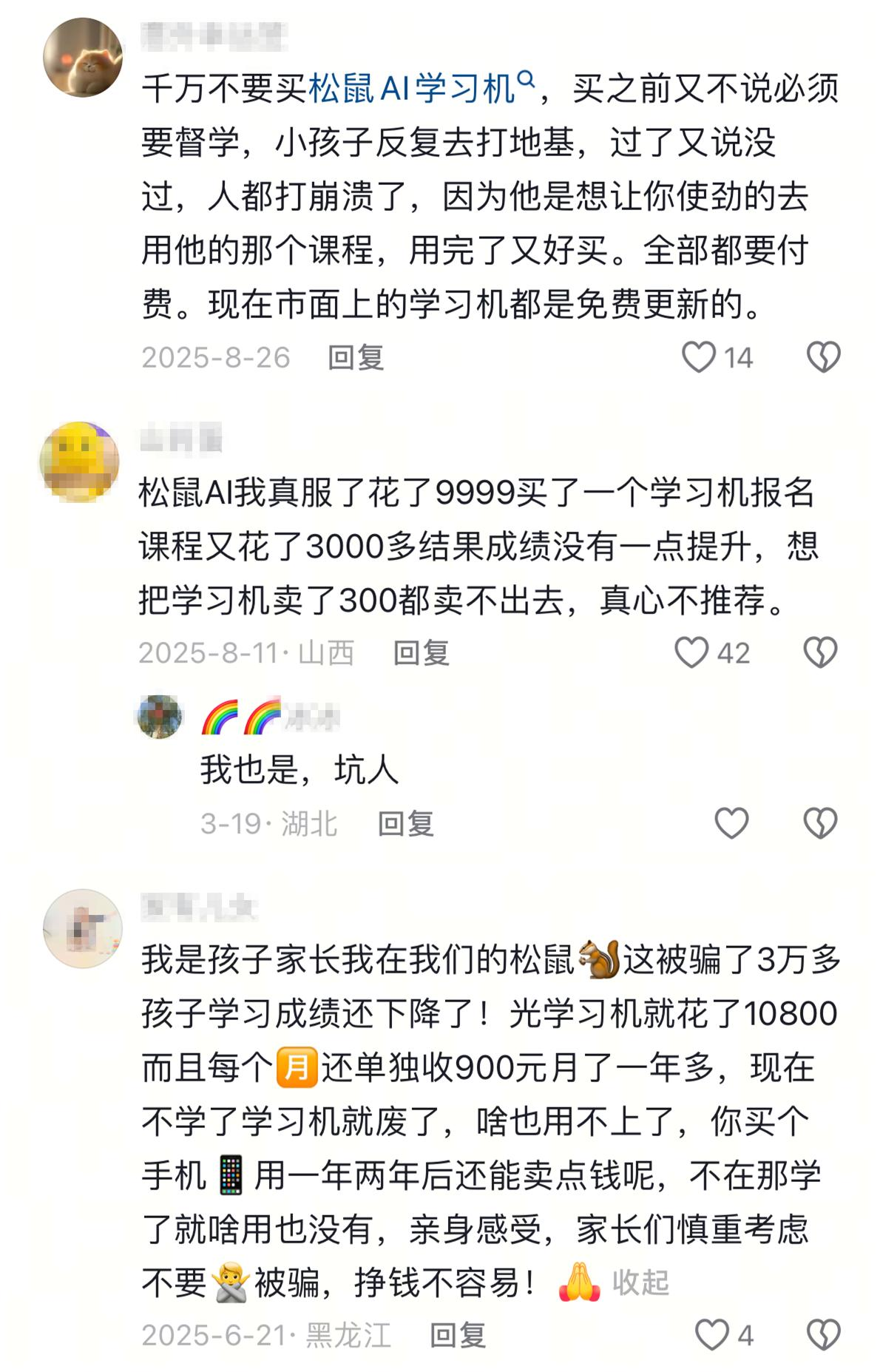 记者在采访中发现,网络上对于松鼠Ai学习机的评价也是褒贬不一,有网友表示孩子成绩没有提升还下降了,学习机没有用;也有网友表示孩子用了3个月,提高了40分。
