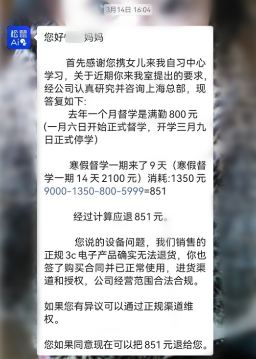 赵女士表示,发现问题后她曾多次与机构沟通解决方案,并要求退费,对方以“销售的正规3C电子产品确实无法退货”为由,仅同意退还851元寒假班课时费。随即,赵女士要求该机构提供收据中标明的数学、英语、物理、化学四门课程的课时明细,至今未获回应。