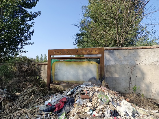 在柳杭头“东湖”地块西侧,竖着一块宣传耕地保护政策的宣传栏,年久失修,宣传栏上早已没有任何内容。只有宣传栏的金属边框上还镂刻着“节约集约用地 严守耕地红线”几个大字,在风吹日晒下早已没有了本来的颜色。宣传栏前,也成了村民们堆放垃圾的垃圾场。